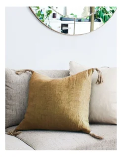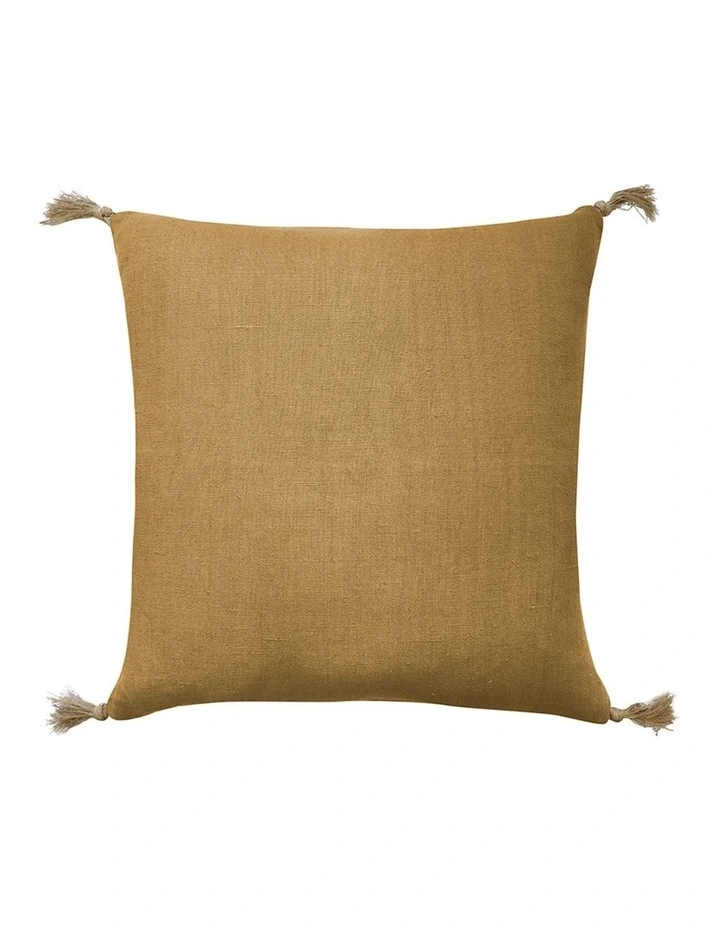 Our Goa Linen Tassel Cushion features a mustard linen front with a knotted natural linen tassel on each corner. It is finished with a natural linen reverse and a duck feather filler.