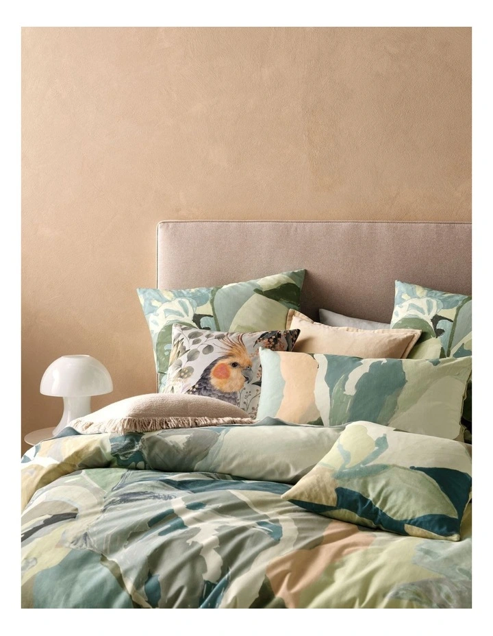 Rejuvenate your boudoir with this hand-painted tropical leaf print in vibrant greens, blues and neutrals across a textured cotton slub. Foresta looks a delight embellished with its coordinating European pillowcases and cushion to complete the aesthetic.